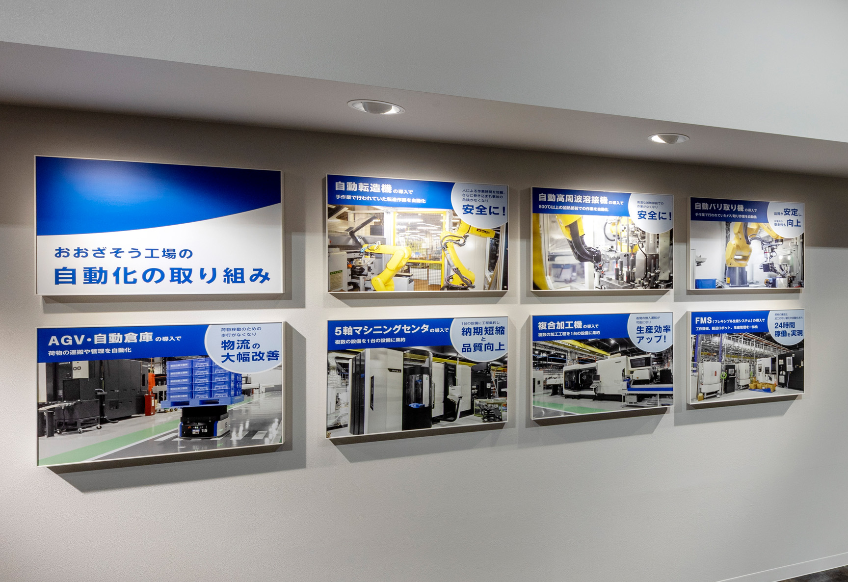 来場者はまず「知る」コーナーの展示を通じて、前身となる企業の創立からおおざそう工場ができるまでの歴史や代表的な製品を学ぶ。続いて、「触る」コーナーで実際の製品に触れ、その魅力を体感する。そして「見る」コーナーでは、「知る」「触る」で積み重ねた知識・体験を背景に、従業員が実際に働いているモノづくりの現場を見学する。一般には馴染みの薄い製品が多い中、この一連の流れを取り入れることで、立場や世代を問わず理解を深めて楽しめる、ストーリー性のある構成となった。