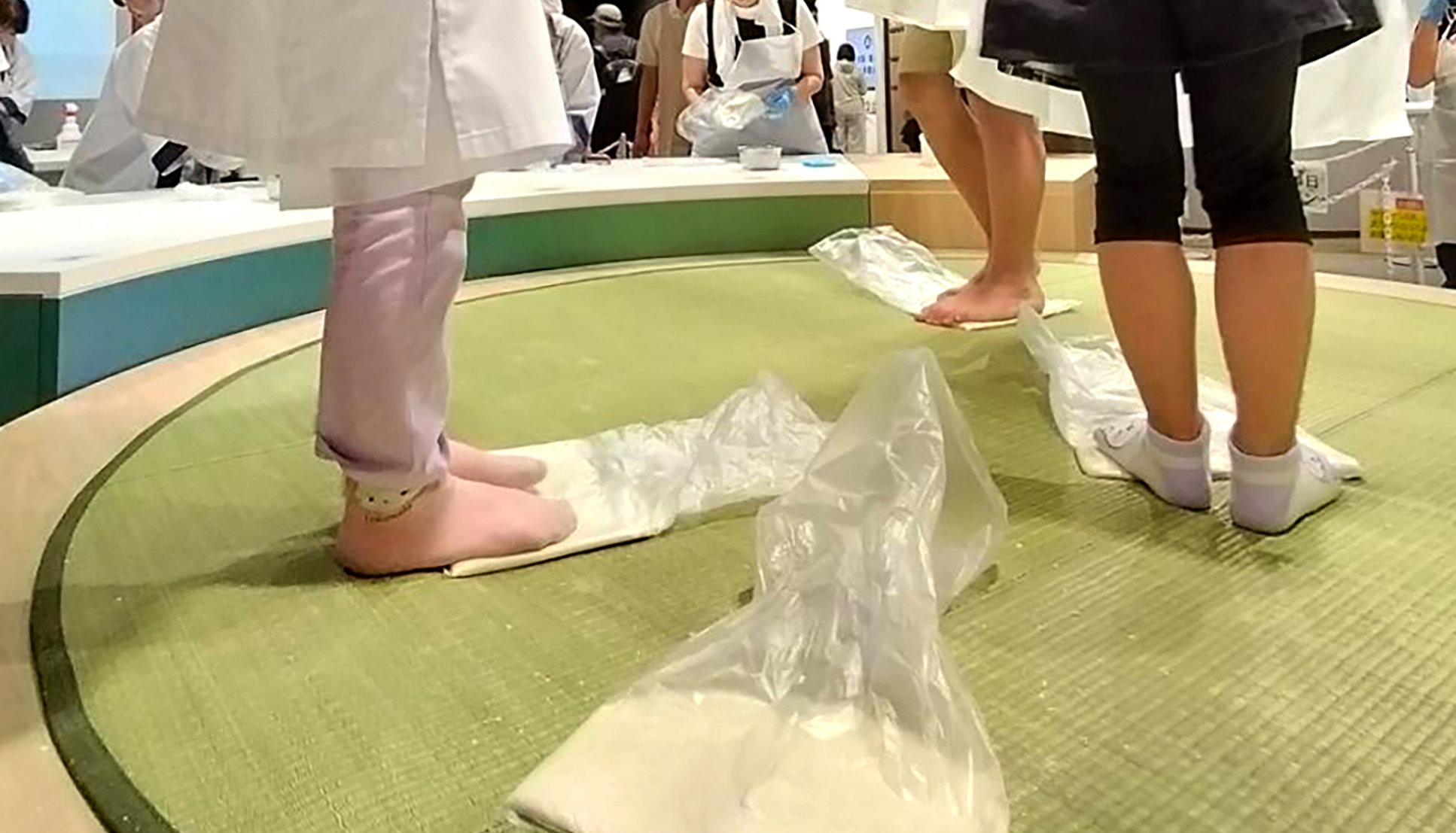 「楽しく“魅せる”うどん打ち」をテーマに、参加者自身が主役であり観客にもなれるブースを目指して会場をデザイン。うどん打ち教室のハイライトとなる「足踏み」のスペースをブース中央に設置し、周囲の目線からも高くすることで、体験している姿を皆さまで楽しんでいただけるステージに仕立てました。