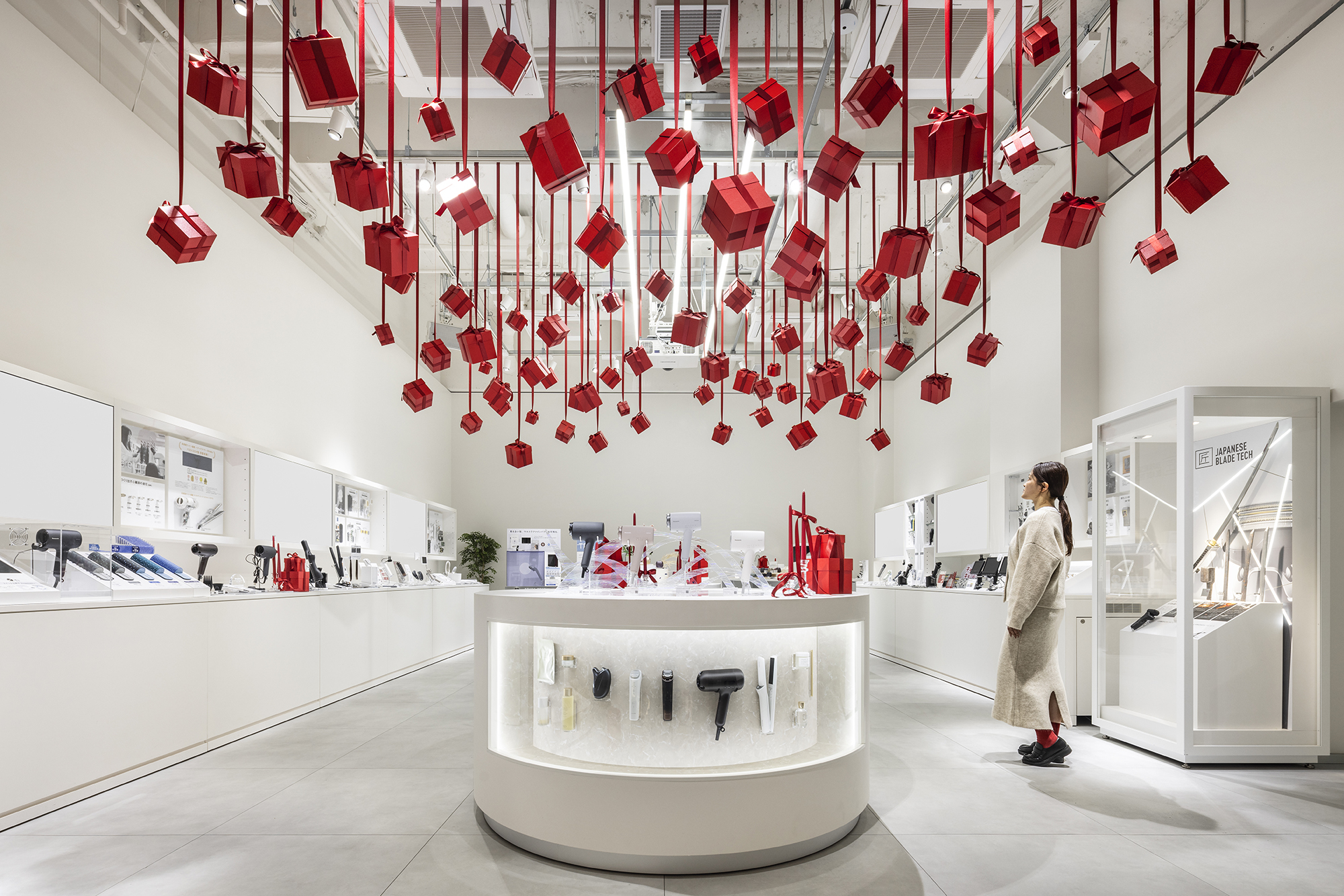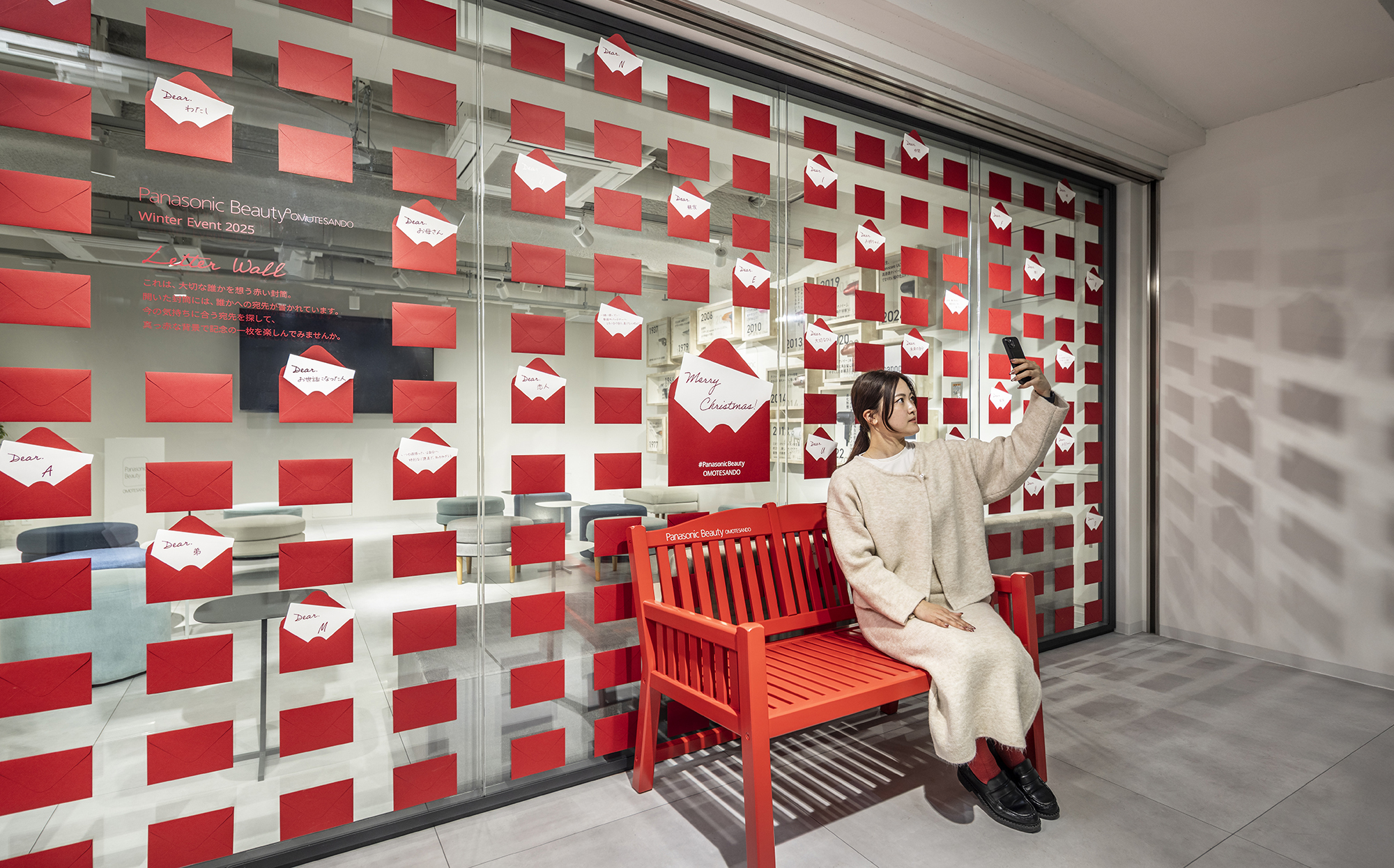 白を基調とした施設に映える赤色のモチーフを効かせたデザインで、ファサードには積み上げられた真っ赤なギフトボックスのアーチがお出迎え。館内には「Dear.」と書かれた封筒を散りばめ、贈りものに込める気持ちを表現しました。