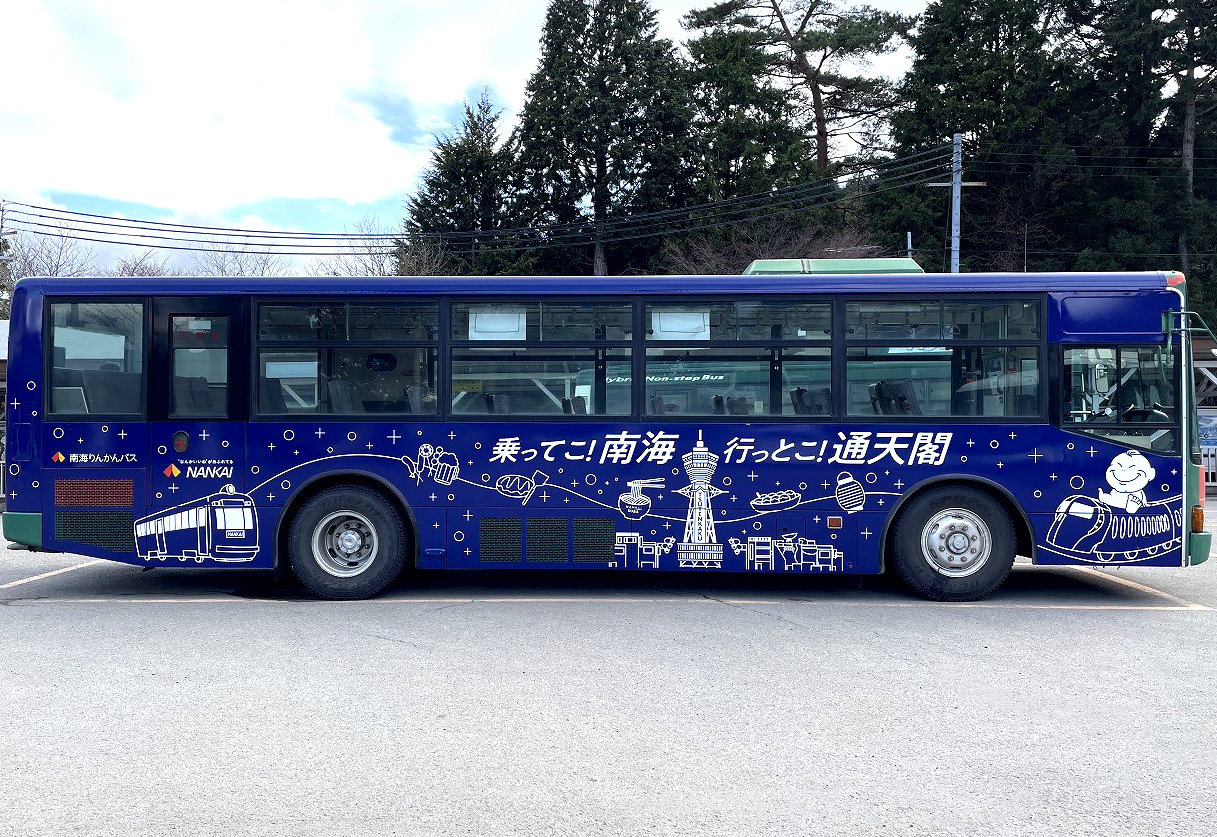 2024年に南海グループに仲間入りした通天閣をさらに盛り上げようと、2025年4月からは大阪・関西万博に訪れる観光客の通天閣への誘致を目的としたプロモーションを実施。「乗ってこ! 南海 行っとこ! 通天閣」「通天閣もなんかい」をキャッチコピーに、路線バスや万博会場へのシャトルバスの車体ラッピングや、ポスター、サイネージ、中づり広告等を幅広く展開しました。